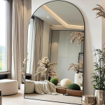 This mirror features generous dimensions and an impressively large reflective surface area. Standing 91 inches tall and 46 inches wide, it offers a panoramic view—making it ideal for dressing rooms, boutique fitting rooms, or spacious bedrooms where multiple people might use it simultaneously. A black frame creates a unified border that seamlessly outlines the glass. The arched top softens the upper edge, preventing the rectangular form from appearing overly rigid or k. Designed as a floor-standing piece, the mirror features a sturdy structure that rests securely on any flat surface. In a dressing room setting, its ample width allows you to view your entire outfit from multiple angles without needing to move around excessively. The black finish serves as a visually understated element, ensuring that the mirror’s reflection remains the primary focal point. Its substantial size makes it a element in any room, effectively filling wall space while serving a highly practical function.